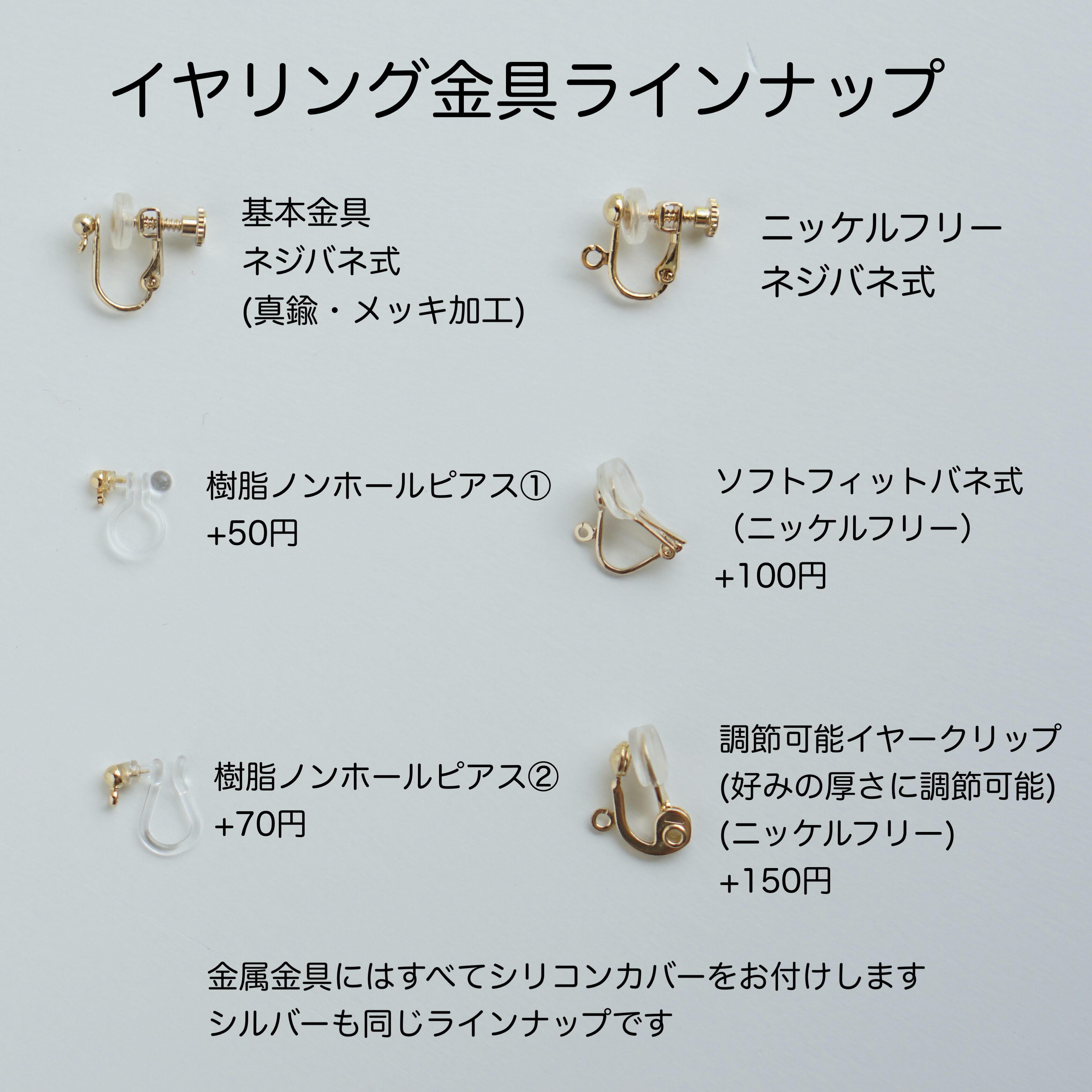 貼り付けタイプの金具は基本的にニッケルフリーのものですが、ノンホールタイプ(+50円)や調節可能イヤークリップ(+150円)、ソフトフィットバネ式(+100円)にも変更可能です。