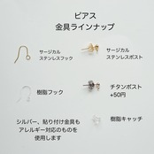 ニッケルフリー金具や樹脂ノンホールタイプ、痛くなりにくい金具、ピアスに変更をご希望の方は、オプションよりお選びください。